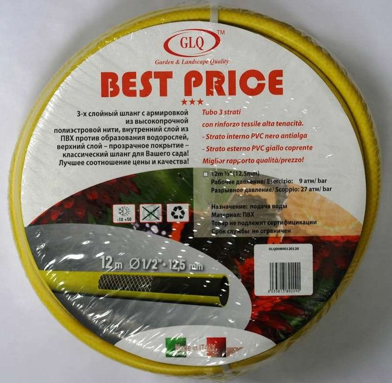 Армированный 3-х слойный шланг GLQ BEST PRICE 12м 1/2 применяется для подачи не питьевой воды к месту полива.