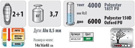 Палатка для велосипедистов и всех, кому в походе необходима двухместная палатка с большим вместительным тамбуром. Технические особенности: – Пропитка, задерживающая распространение огня. – Швы герметизированы термоусадочной лентой. – Узлы палатки, испытывающие высокие нагрузки, усилены более прочной тканью. – Край тента обшит прочной стропой. – Молнии на внешнем тенте фиксируются алюминиевым крючком. – Внутренняя палатка оснащена противомоскитной сеткой, четырьмя карманами, кольцом для фонаря. – Большой вместительный тамбур, в котором можно разместить пару велосипедов, походную кухню и все необходимые вещи. – Три входа в палатку.
