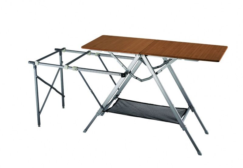 Складная кемпинговая кухня. Прочная алюминиевая конструкция холодного анодирования, бамбуковая столешница и подставка для установки газовой плиты или BBQ модуля. Телескопические ножки регулируются по высоте. Продажа только с чехлом, чехол приобретается отдельно. Возможность продажи складной кухни без чехла уточняйте у менеджера.