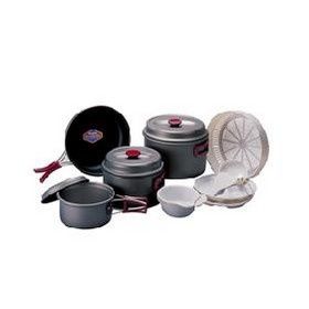 Набор легкой походной посуды из алюминия с холодным анодированием, рассчитанный на 5 - 6 человек. Набор состоит из трех кастрюлек объемом 2.6 литра, 1.8 литра и 1 литр, удобной сковороды, 3 тарелки, 5 пиал, дуршлага, лопатки и складного-половника. Анодированный алюминий обладает повышенной теплопроводностью, в связи с чем пища готовится значительно быстрее. Материал так же показывает прекрасную устойчивость перед окислением, даже во время длительной эксплуатации. Количество персон 5-6 Покрытие - холодное анодирование Комплектация - кастрюля с крышкой 2.8 л.; кастрюля с крышкой 1.8 л.; кастрюля с крышкой 1 л.; тефлоновая сковорода; дуршлаг; пластиковая пиала 5 шт.; пластиковая тарелка 3 шт.; складной половник; лопатка; чехол с ручками.