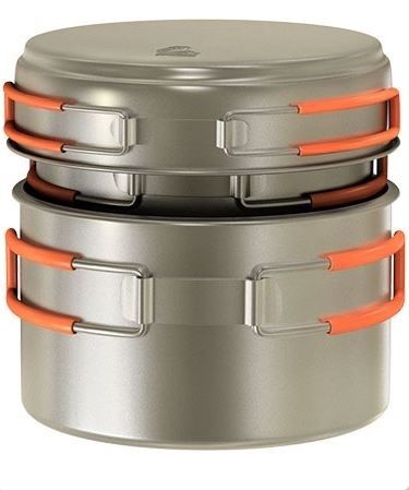Легкий набор кастрюль из титана объемом 1.2 и 0.8 л. с крышкой-сковородкой для готовки на горелках и примусах. Экологичность, минимальный вес и высокая прочность материала. Имеет крышку-сковороду, в которой можно подогреть еду. Складные ручки покрыты огнеупорным силиконом. Совместимость по размеру со многими наборами посуды. Яркий и удобный чехол на затяжке. Комплектность: